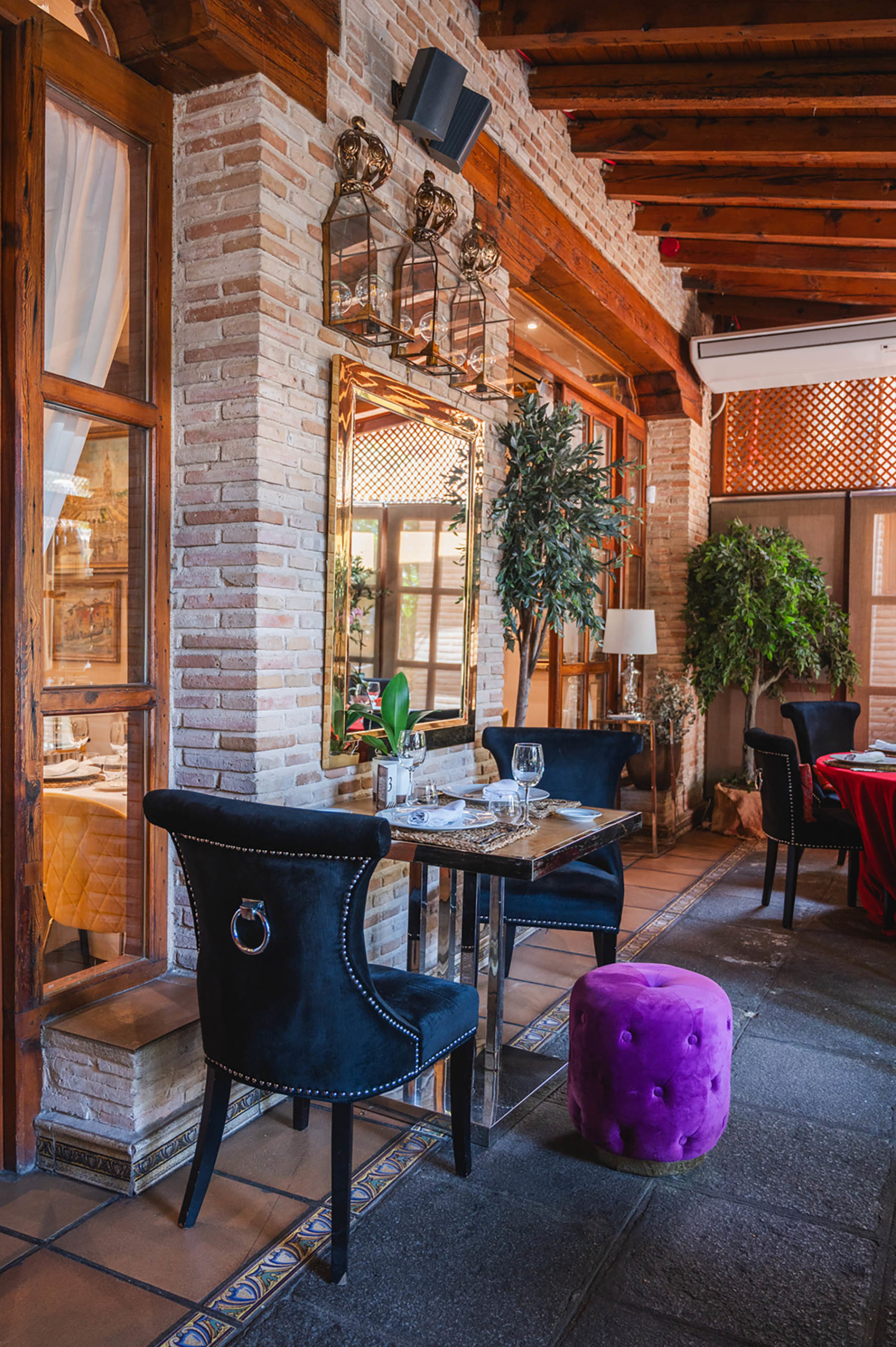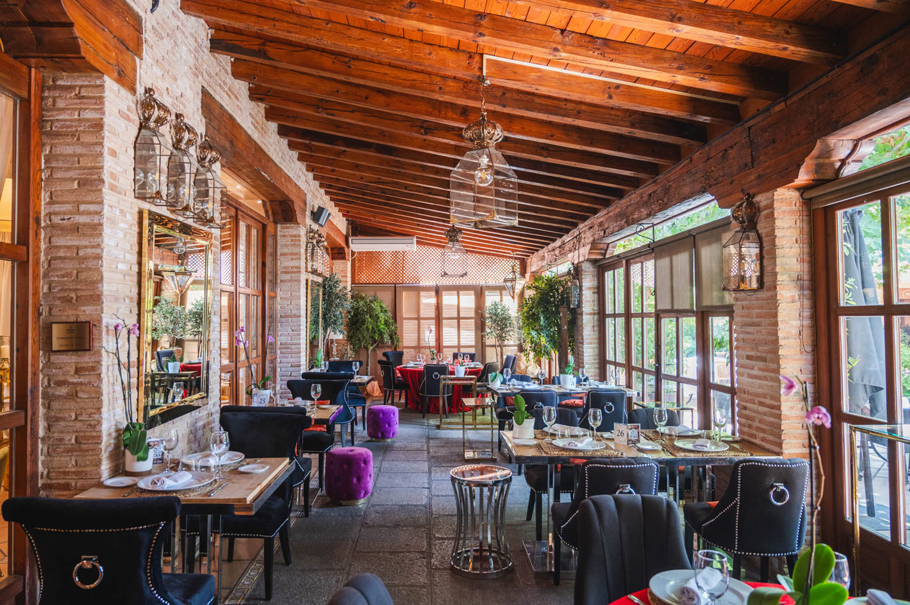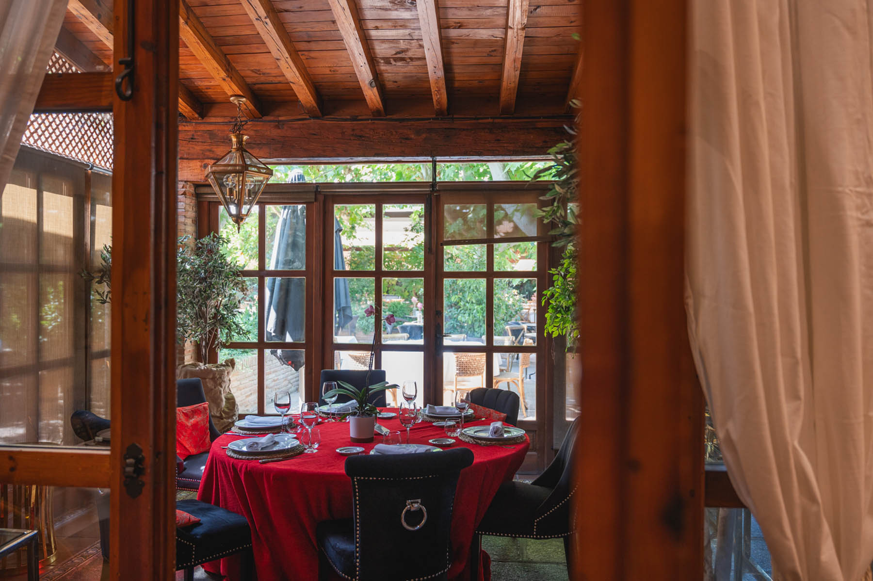 Las grandes puertas de madera y cristal que separan el salón de nuestra fantástica terraza se pueden abrir para que la experiencia gastronómica sea aún más placentera. Podrás comer y estar en contacto con la naturaleza sin estar directamente en el exterior. Nuestra galería acristalada es muy luminosa y está decorada con el sabor del paso del tiempo sin olvidar la comodidad y últimas tendencias actuales en decoración.